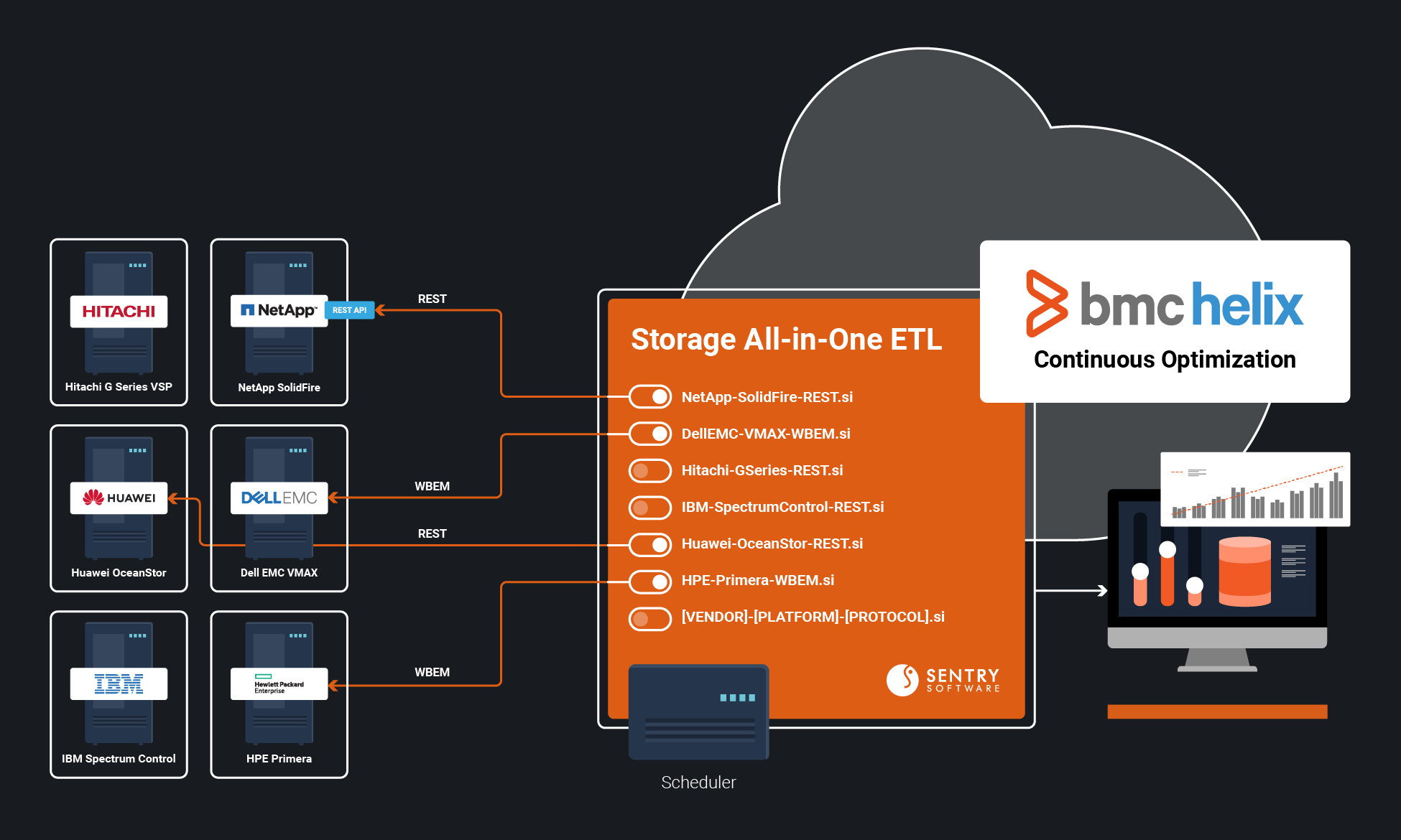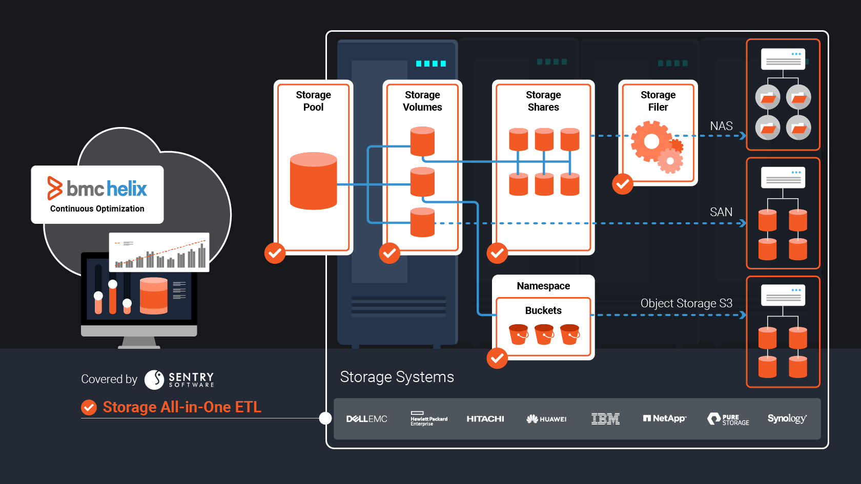 Storage All-in-One ETL is built to work seamlessly across the widest range of storage systems in the industry. Whether you rely on Dell EMC, Hitachi, NetApp, Pure, HPE, IBM, Huawei, or others, the solution delivers consistent, vendor-agnostic insights straight into BMC Helix Continuous Optimization.